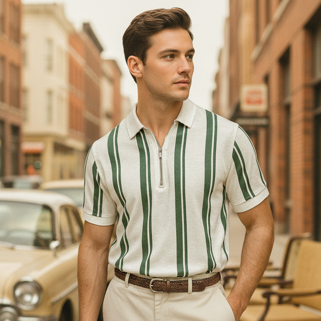 This Striped Zipper Polo in black offers both style and functionality. Made of fine terry fabric, it features a unique zip-neck design and classic stripes. Elevate your wardrobe with this versatile and comfortable polo t-shirt.